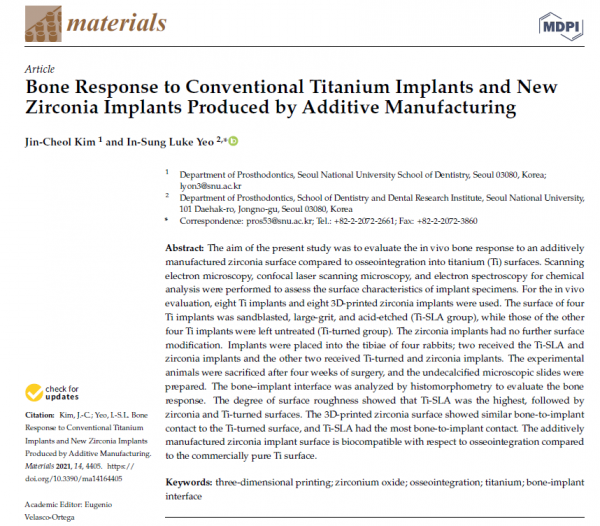 3D printing 기법으로 제작된 지르코니아 임플란트의 생체 내 골 반응을 평가한 연구로,