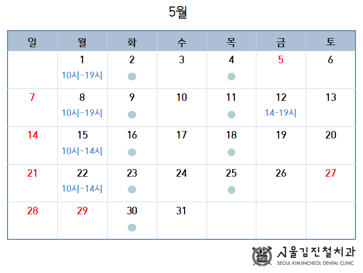 5월 5일(어린이 날), 27일(부처님 오신 날), 29일은 휴진입니다.